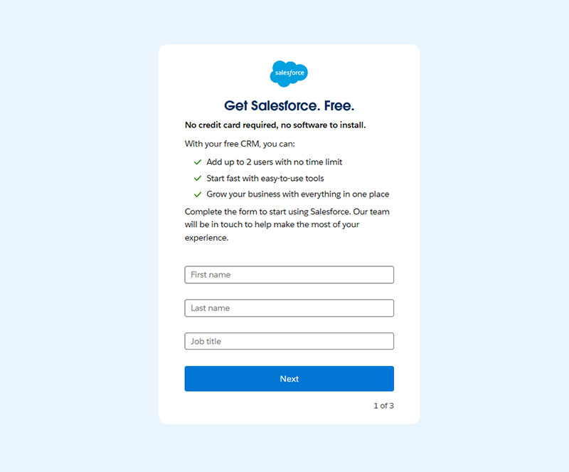 Credit-card-required trials filter for serious buyers. Lucidchart asks for payment at step 3 of 3. Salesforce and HubSpot skip the card entirely.