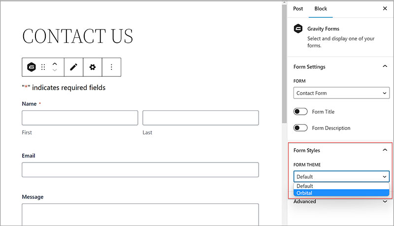 Visual theme customization through built-in settings (Gravity Forms 2.5+). Adjust colors, fonts, spacing without touching code.