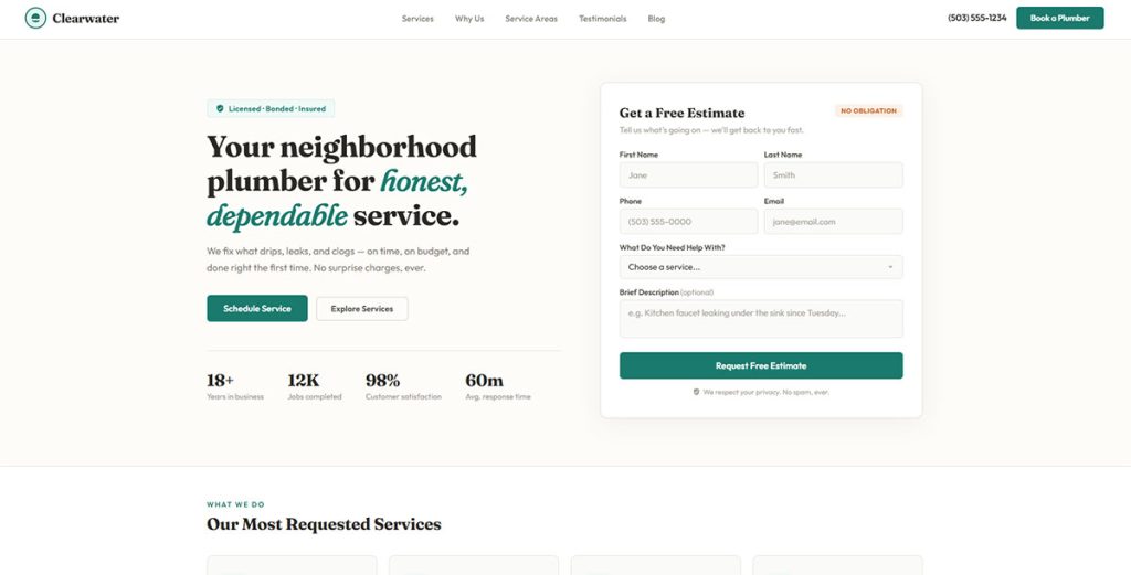 Plumbing Webmasters’ CRO data confirms that forms with three fields or fewer get higher completion rates, but adding more fields filters out low-quality leads. The right balance depends on your lead source. If most leads come from organic SEO (already high-quality), keep forms short. If you’re running broad paid campaigns, add a qualifying question or two.